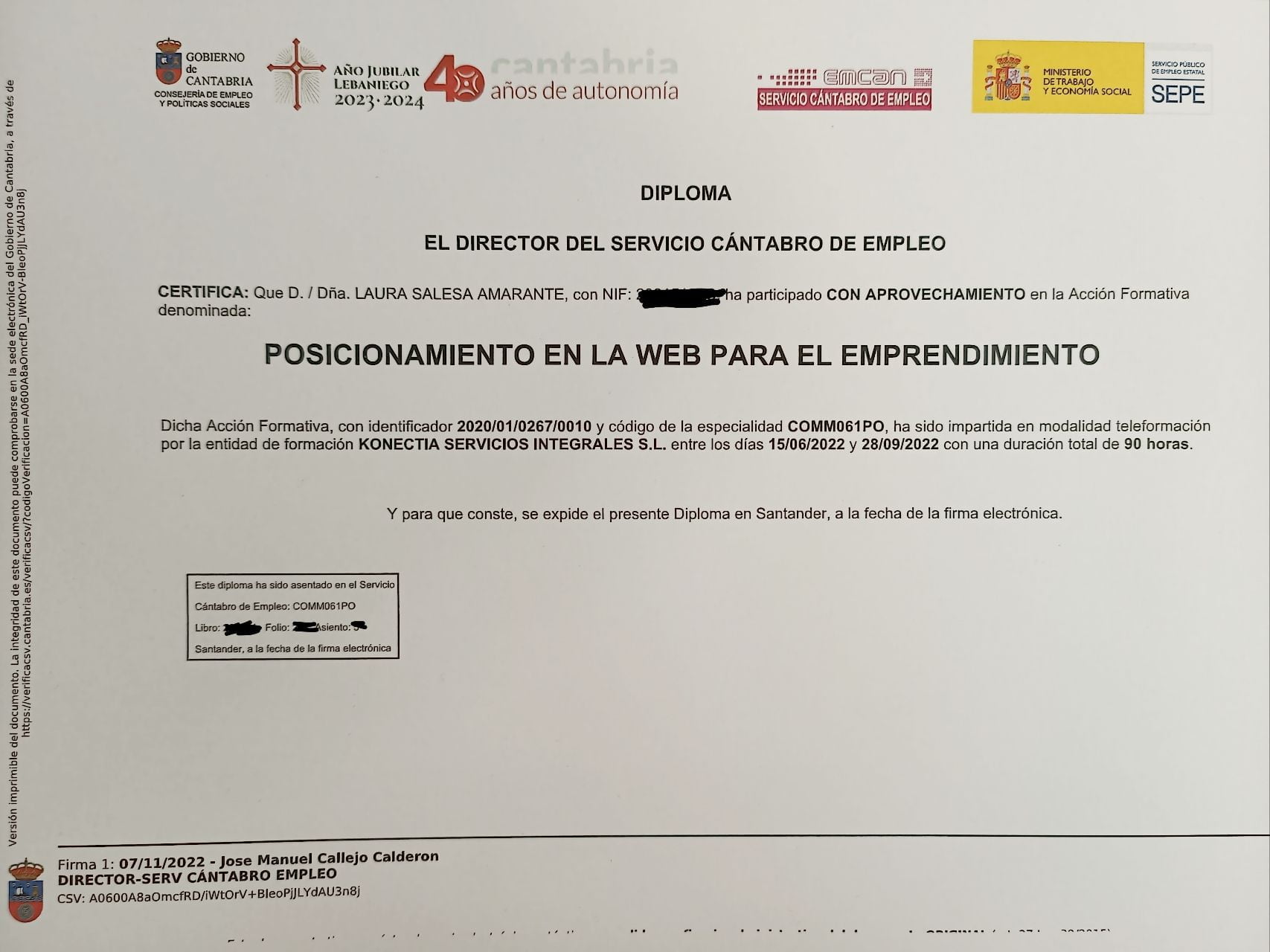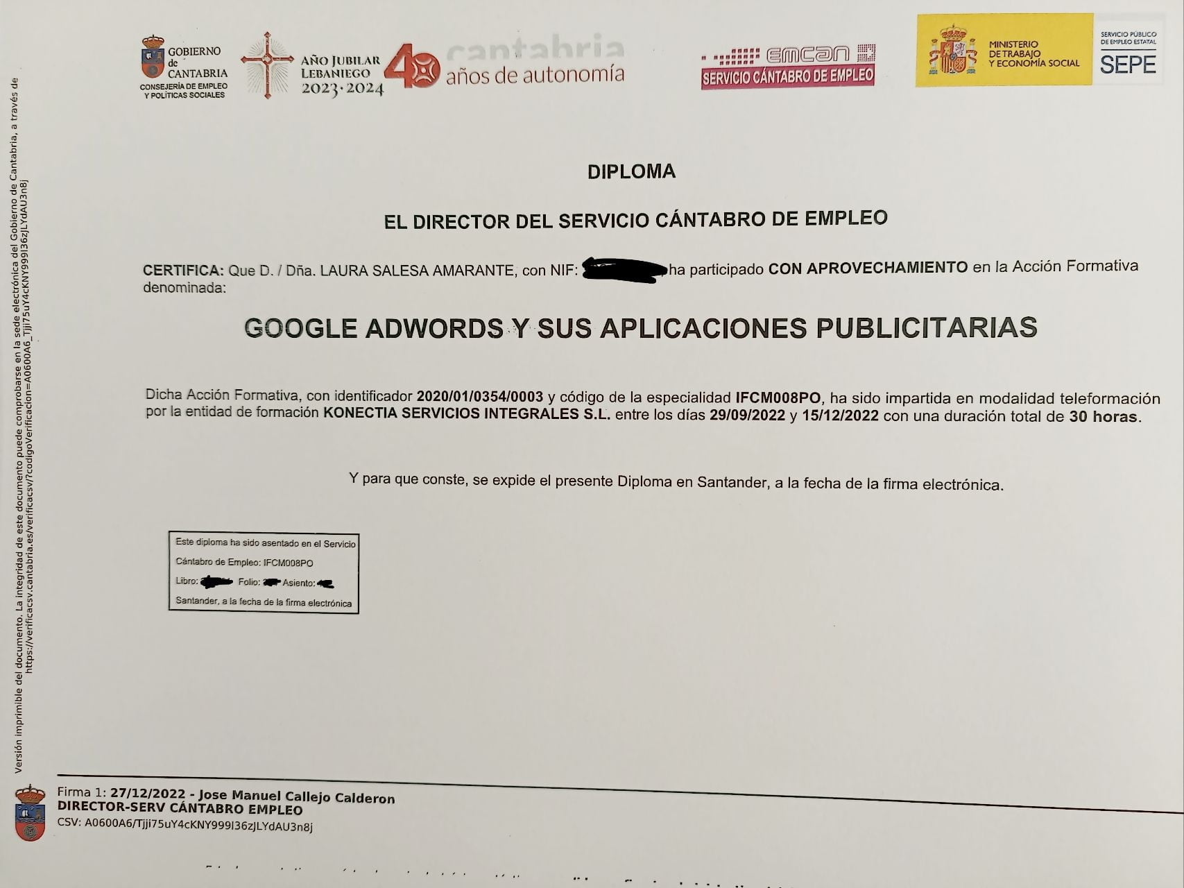 Recientemente he completado dos certificaciones sobre Google Adwords, emprendimiento digital y posicionamiento web, transformación digital.